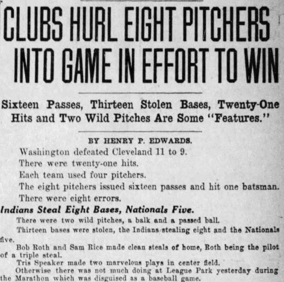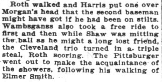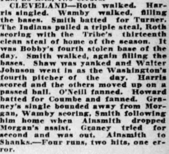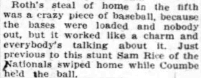 Anyway, Roth’s sixth steal of home in 1917 came in the bottom of the fifth inning, and just so happened to be his fourth stolen base of the afternoon: