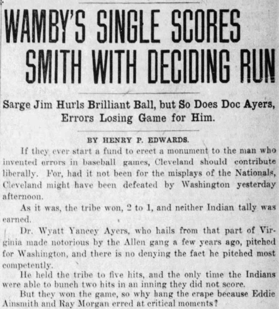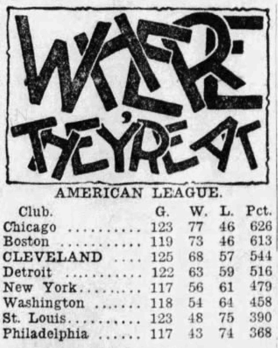 This was back in the deadest part of the deadball era, back when games were won and lost on baserunning plays and errors. In fact, on August 26th, the Indians managed to barely beat Washington because of defensive misplays: