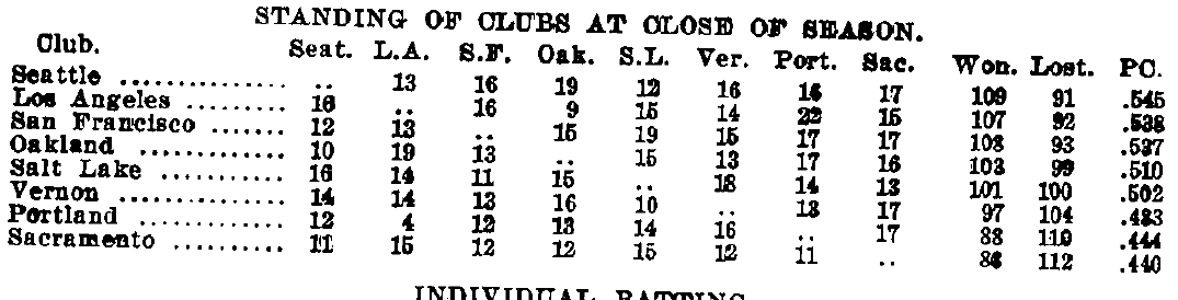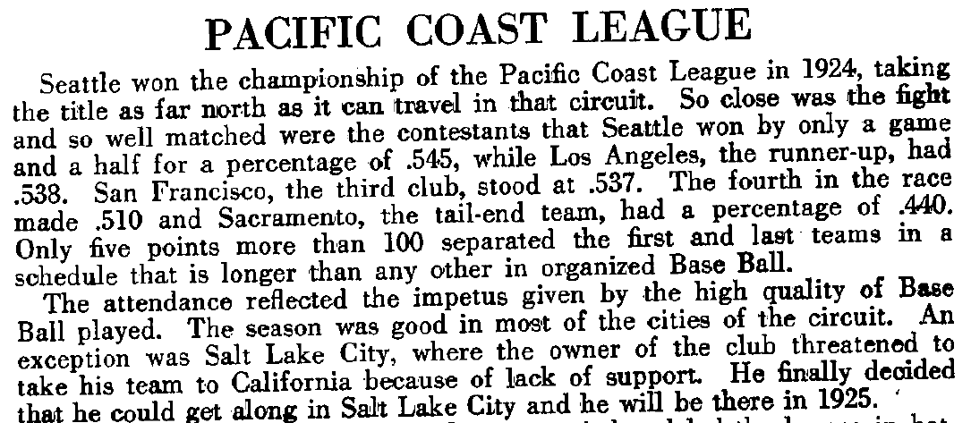 And, second, you should know that the 1924 Pacific Coast League was one of the most exciting seasons in league history. Here are the final standings as reported by the 1925 Spalding Guide: