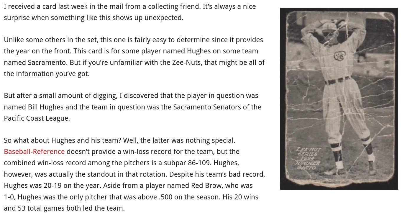 The article in question is about an extremely poor condition Bill Hughes card from 1924. Among other things, the author did a little bit of research beyond the lack of information on Baseball Reference about the 1924 PCL. He came up with this: