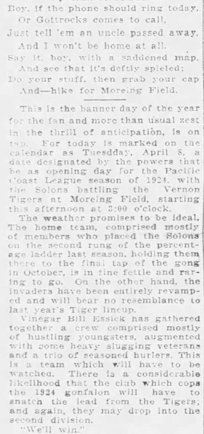 Anyway, the article itself is a little bit sparse, so I thought I would do some newspaper research. After all, I’ve got access to a lot of old newspapers, and it’s not really that hard to figure out what happened in the 1924 Pacific Coast League.