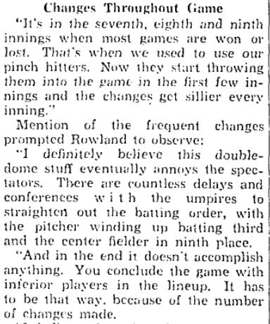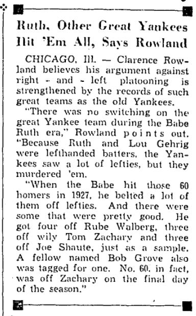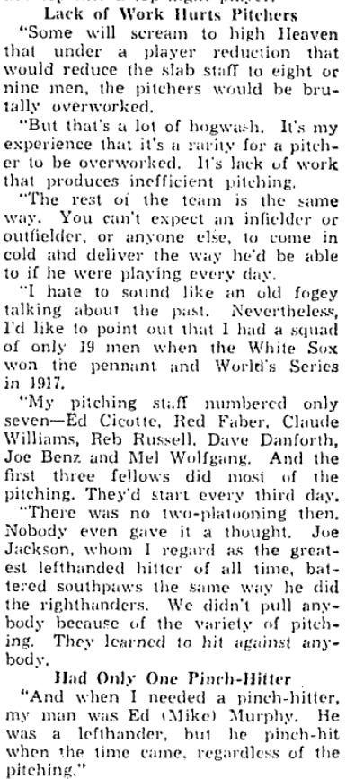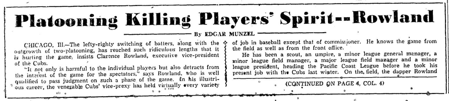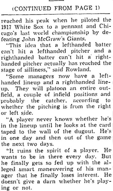 You know, Pants Rowland is a pretty interesting person to quote on this subject. The 1917 White Sox faced four straight left handed starting pitchers to start off the season - but Rowland didn’t make a single change to the lineup. It was precisely the same lineup that he used against the right handed pitchers they faced on April 16, 17, and 20 - and it was more or less the same lineup the White Sox had all season long. And it doesn’t seem that he used much platooning in the World Series, either.