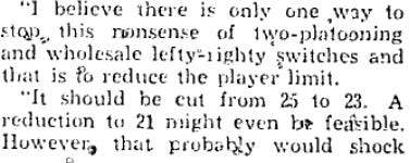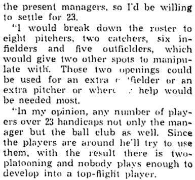 It is interesting to read about managers of many decades ago and their approach to platooning.The stats available were limited,so much was put onto a skipper’s personal knowledge of individual matchups.going forward to the paragraph about Team player limits,MLB did just fine with 25 players.most teams carried 10 pitchers.this lasted well into the early 2000’s.