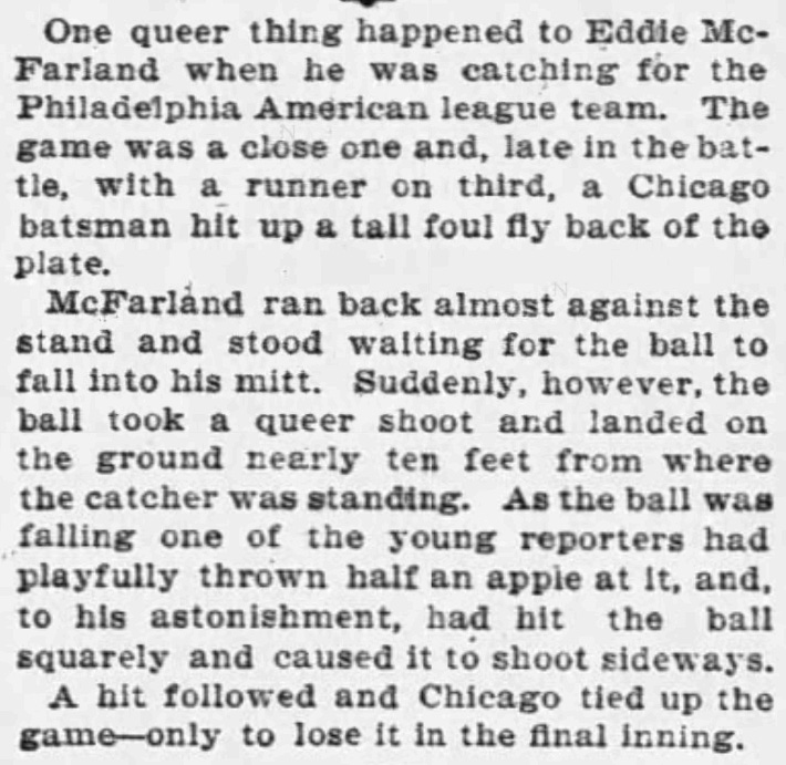 Now, doing a textual search isn’t necessarily the best way to find this sort of thing. There’s an outside chance that there might have actually been a young reporter who somehow threw a half eaten apple all the way from the press box to make McFarland miss the foul ball.