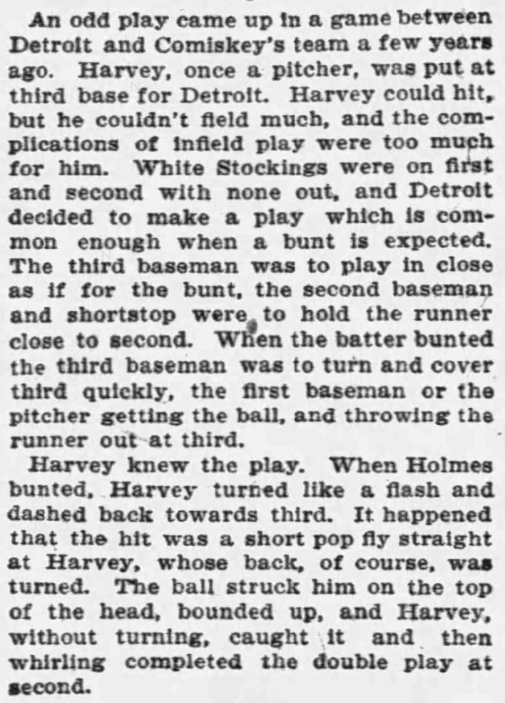 Probably doesn't help. but Chicago and Detroit played in the American League when it was a minor league in 1900, and both Harley and Holmes played for Detroit that year. Nobody named Harvey, though, and Harley didn't pitch or play infield. that year either. The teams would have played when it was still the Western League in 1893-99, but "Comiskey's team" was in St. Paul then; it didn't "invade" Chicago until the league prepared to go national. (Fullerton's article doesn't SAY that the team was in Chicago when this happened, or that he was there.) I can tell you that nobody named Harvey is listed anywhere in the Western League in 1899 in the Reach guide, and Harley was at Cleveland that year. (Somebody reprinted most or all of the 19th century Spalding and Reach guides about 25 years ago, but I didn't buy most of the Reach, and Spalding, who wasn't providing the official baseball to the minors, didn't cover them.)