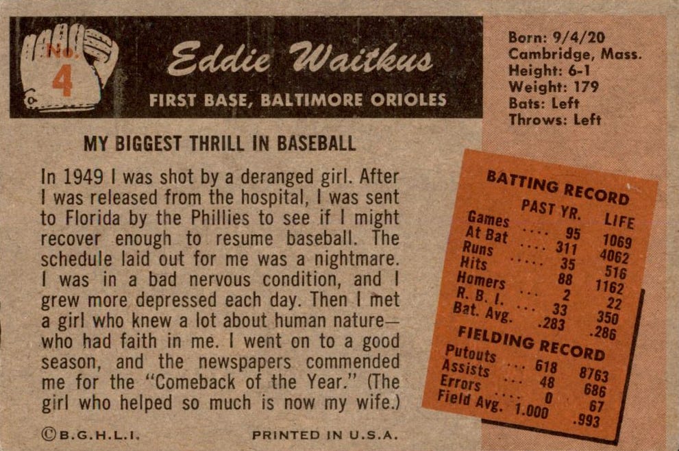 I love those 1955 Bowman "player essay backs". It's also one of my favorite sets, so I have collected a few dozen of them over the years, including Eddie Waitkus. The short paragraphs on the back of those cards capture the spirt of this post well, especially the ones that were written by the players themselves.