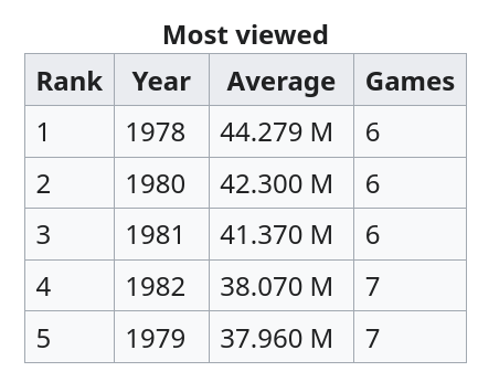 6th and 7th games of the World Series also tend to get higher ratings. This was especially true during the late 1970s and 1980s, that magical period when television viewing had boomed and when cable and sattelite television was still rare: