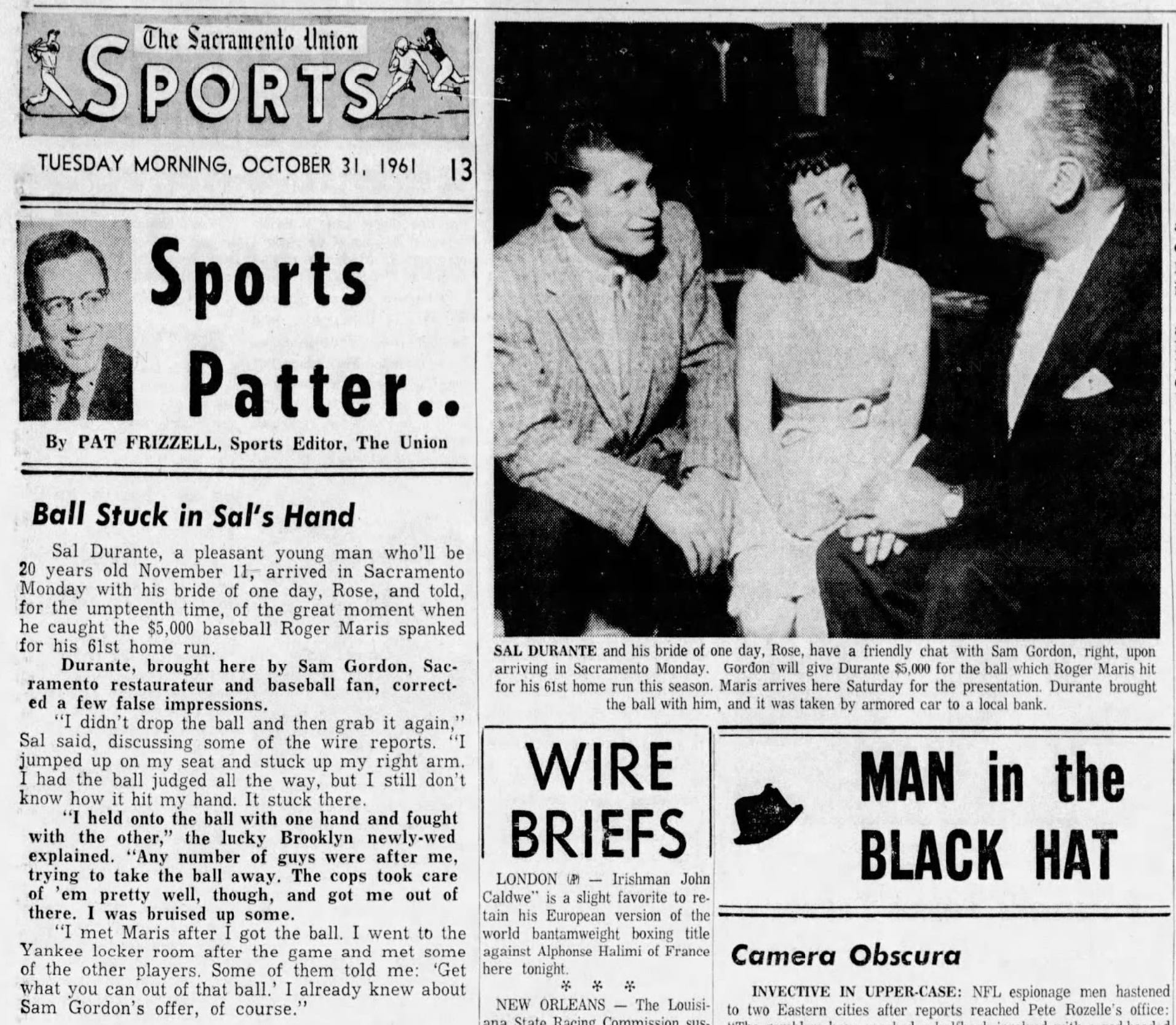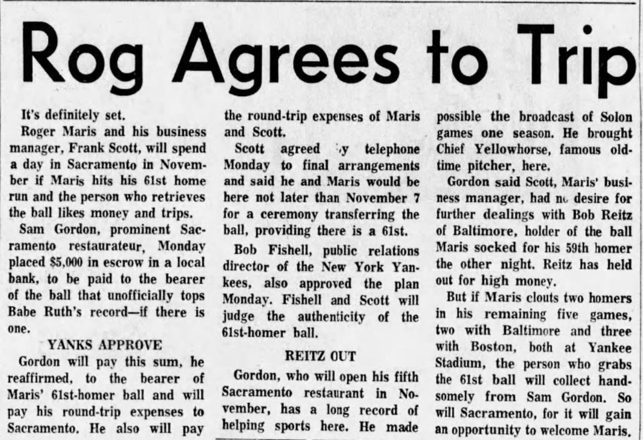 In my mind, though, the most interesting thing is that there actually was an incentive for more fans to attend. A story was printed across the country about a restaurant manager in Sacramento, California named Sam Gordon who offered $5,000 for the record breaking home run: