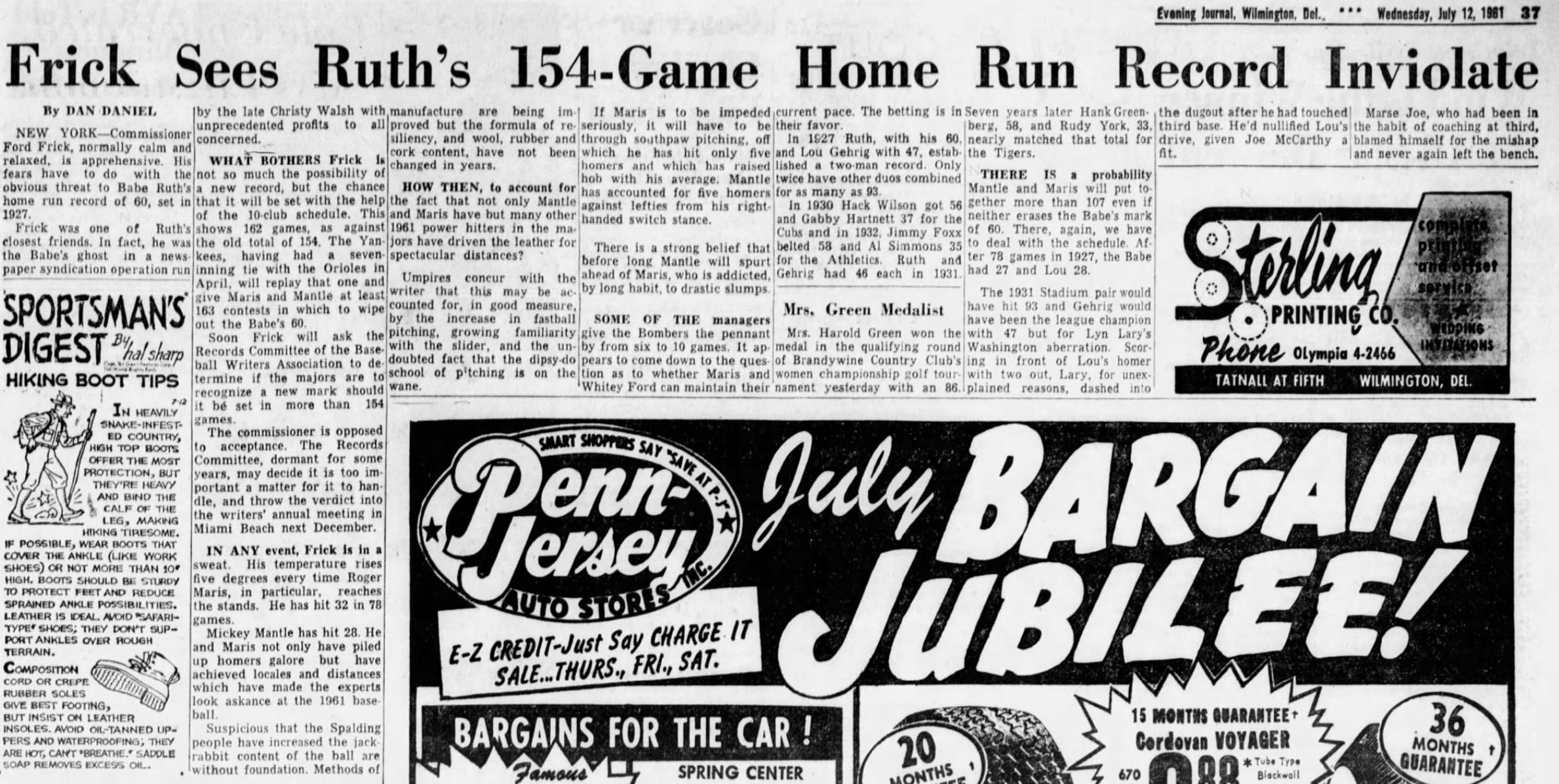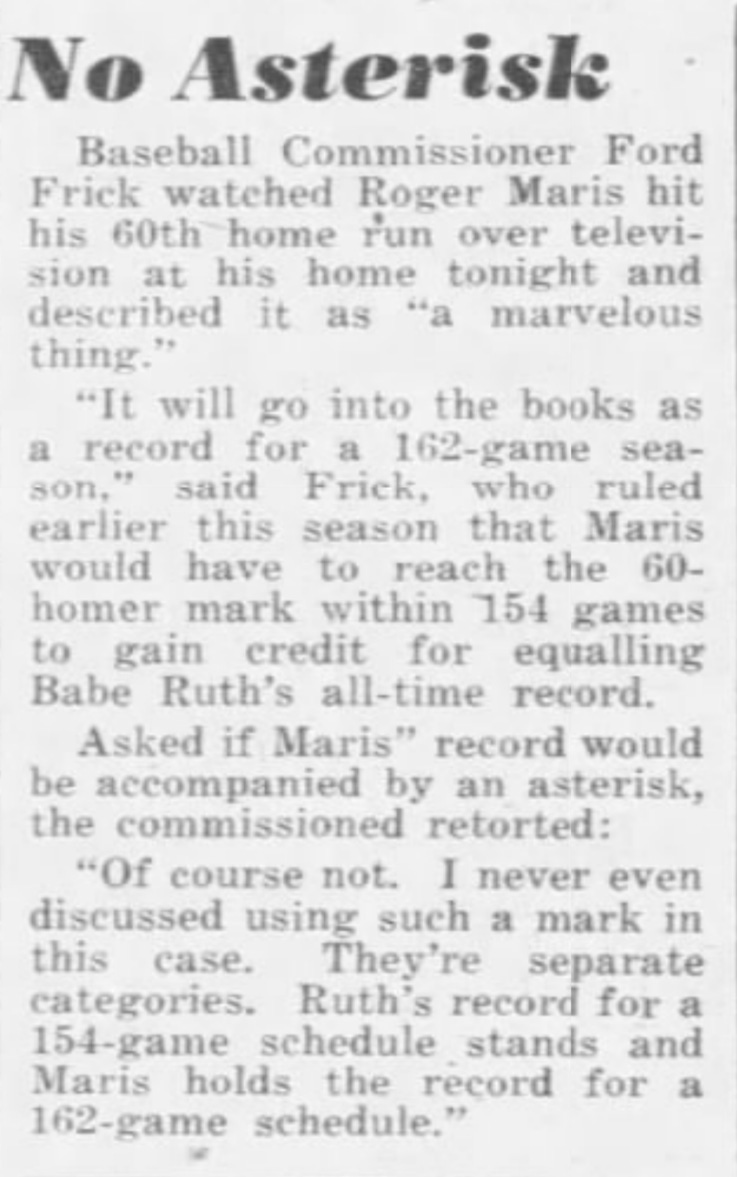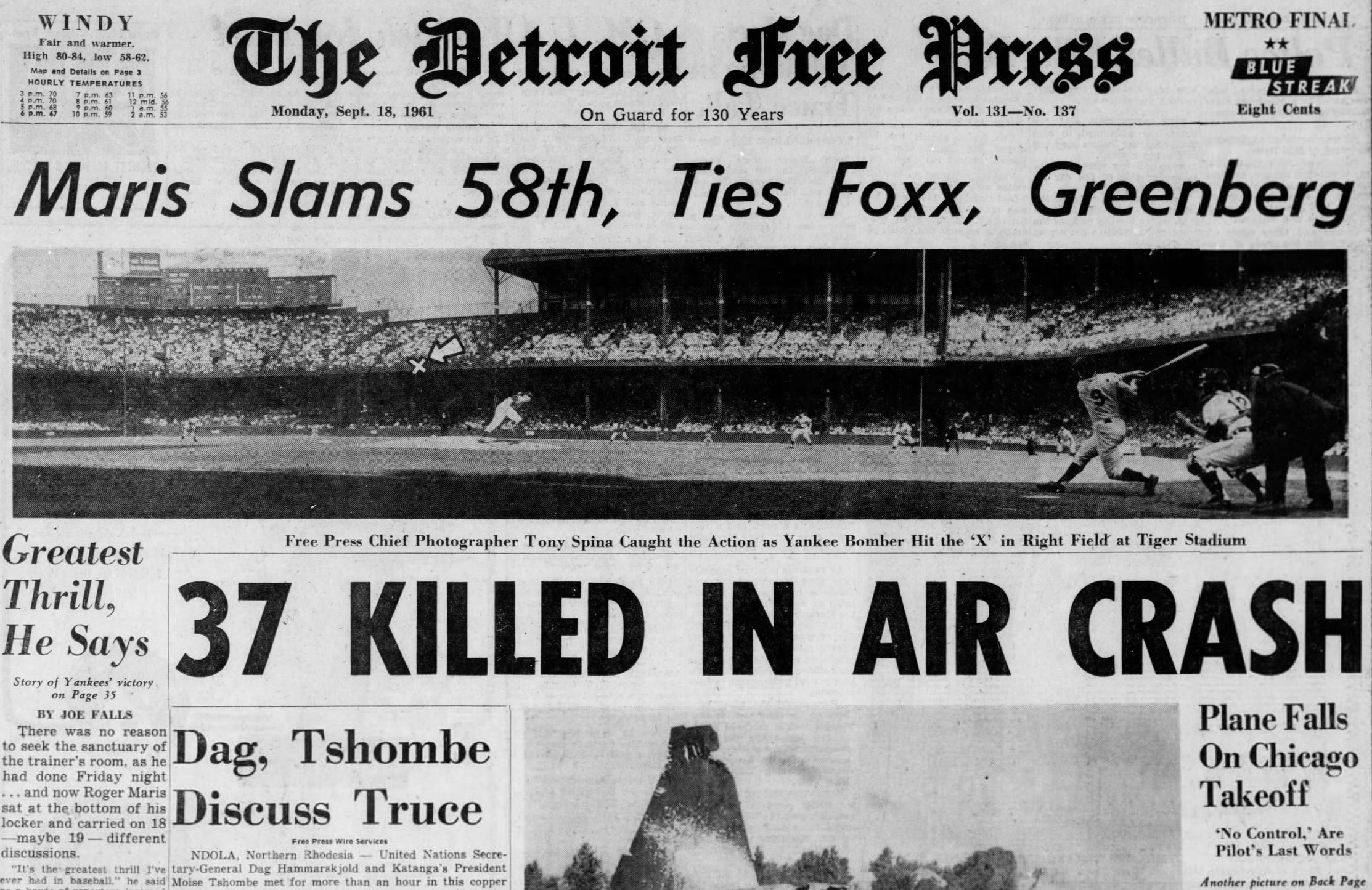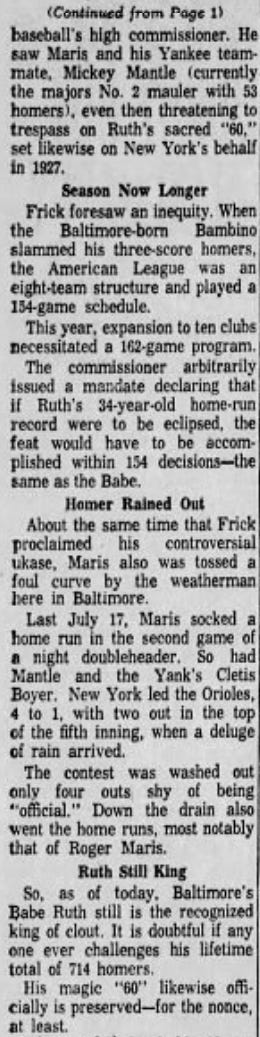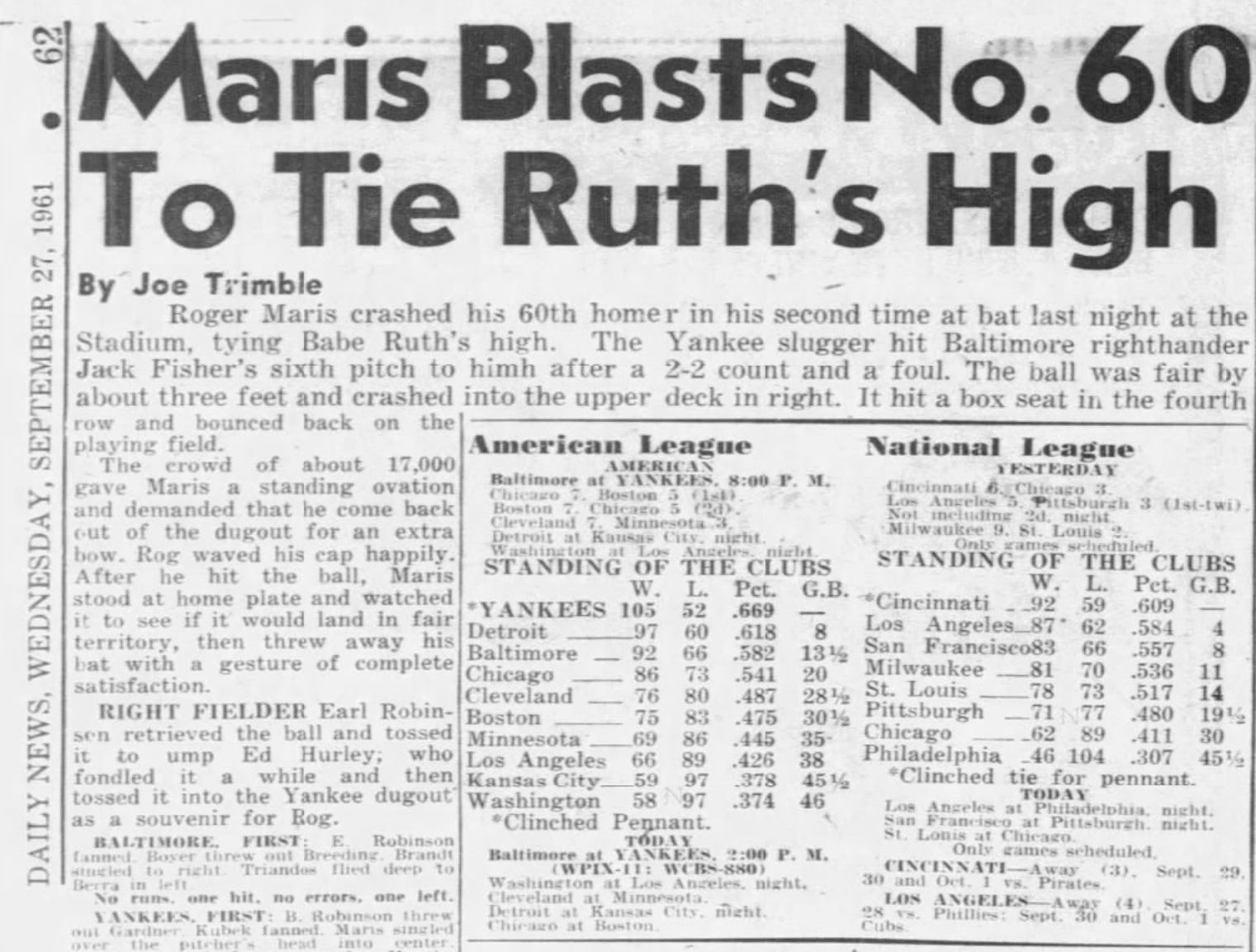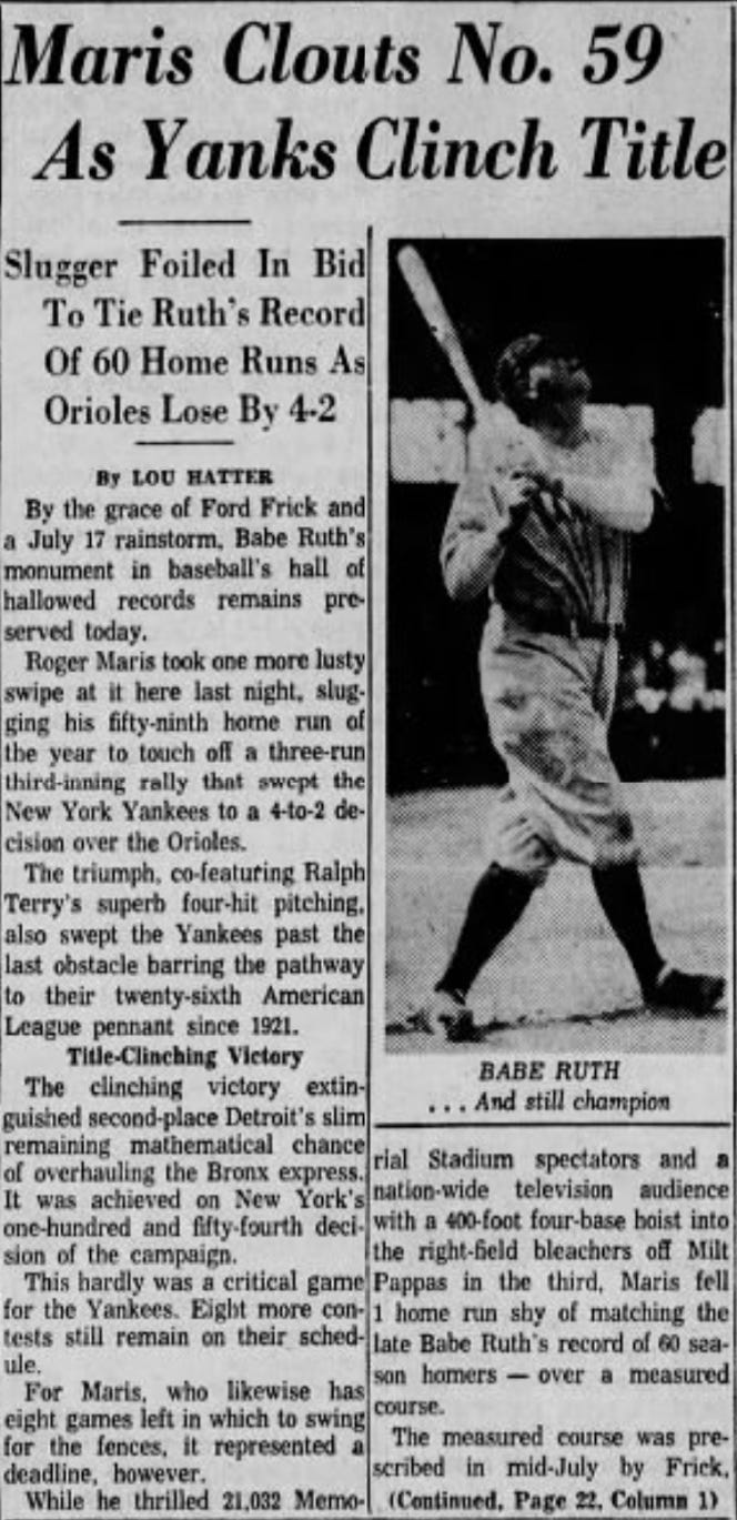 We also forget that Maris was in a little bit of a home run slump. It looked like he was a cinch to hit 60 before the end of the season when he hit his 58th on September 17 at Detroit: