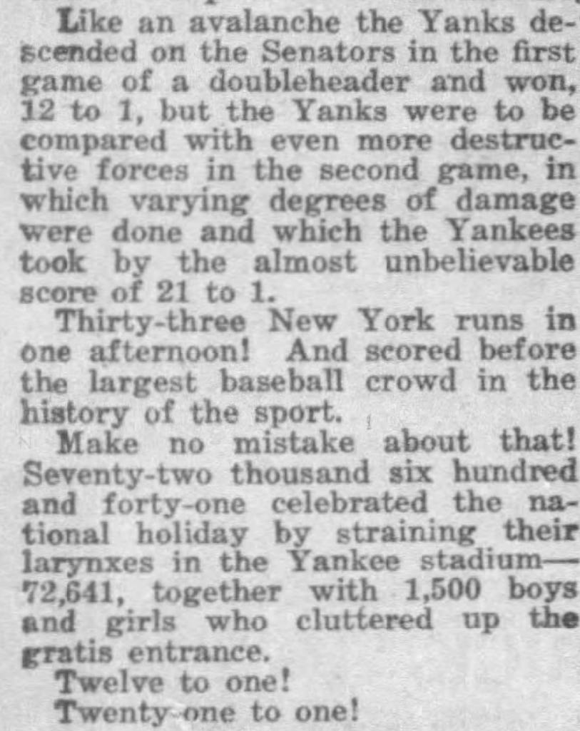 Historically, big baseball crowds were reserved for exciting pennant races and doubleheaders on holidays. If you want an idea of how many people Yankee Stadium could accomodate in 1927, look no further than the traditional July 4 doubleheader: