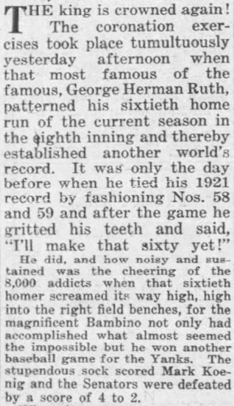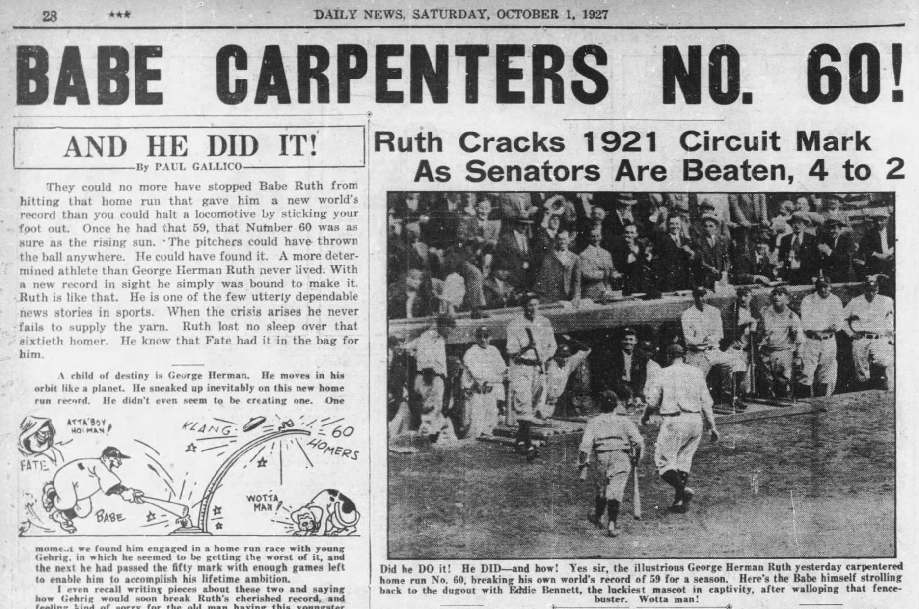 Even with all the hype that The New York Daily News could muster, Ruth’s feat was accomplished in front of a home crowd of only about 8,000 at Yankee Stadium: