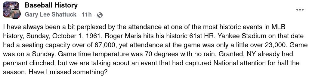 This is actually a good question. Why is it that there was a crowd of only a little over 23,000 at Yankee Stadium on October 1, 1961?
